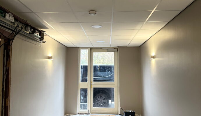 Tijdens dit project hebben wij nieuwe plafonds gerealiseerd en bestaande systeemplafonds vervangen. Ook is de liftombouw uitgevoerd en is het plafond geïsoleerd. In combinatie met een nieuw lichtplan zorgt dit voor meer comfort en een rustigere uitstraling bij binnenkomst.