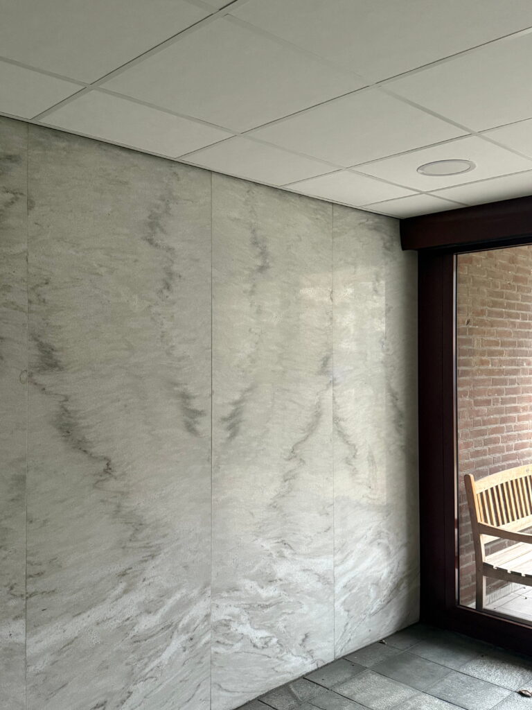 Bijzondere aandacht ging uit naar het herstel van bestaande materialen. De marmeren wanden en de leistenen vloer zijn zorgvuldig in de oude staat hersteld, zodat ze weer aansluiten bij het oorspronkelijke ontwerp van het gebouw. Daarnaast is het schilderwerk van deuren en kozijnen vernieuwd.